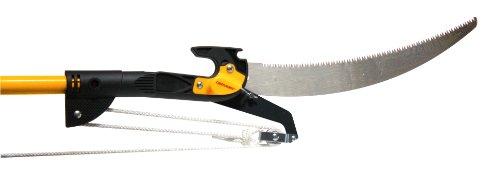 Twelve foot hardened carbon steel tree pole pruner with 1 1/8 inch cutting diameter capacity. Features an adjustable locking device, two pulley action, a fifteen inch detachable universal saw and four point compound cutting action. As an added bonus, the unit also includes a hook for hanging lights in high places.